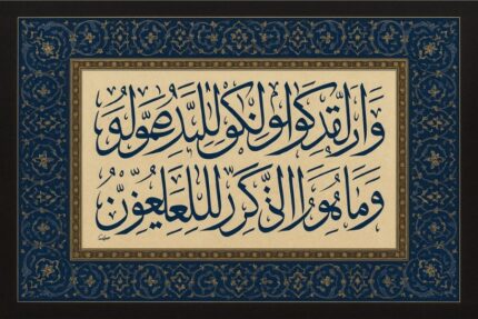 Eserin merkezinde yer alan zarif hat sanatı, Osmanlı süsleme sanatından esinlenen desenlerle birleşerek göz alıcı bir kompozisyon oluşturur. Lacivert, altın ve beyaz tonlarının uyumu, tabloya hem klasik hem de modern dekorasyonlara uygun bir hava katar. Yüksek baskı kalitesi sayesinde yazılar net, desenler ise uzun yıllar boyunca ilk günkü canlılığını korur.
