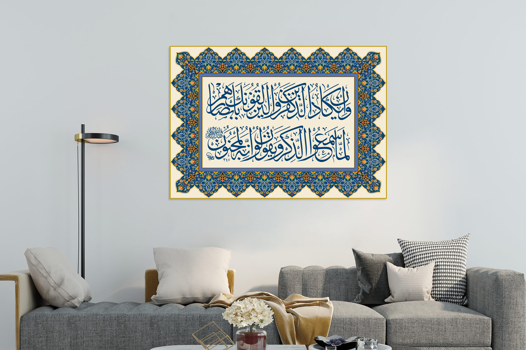Kur’an-ı Kerim’in Kalem Suresi 51–52. ayetleri, nazar ve kötü enerjiden korunmak amacıyla yüzyıllardır okunur. Bu tablo, o ayetleri klasik tezhip estetiğiyle birleştirerek duvarlarınıza sadece bir süs değil, bir huzur alanı kazandırır.