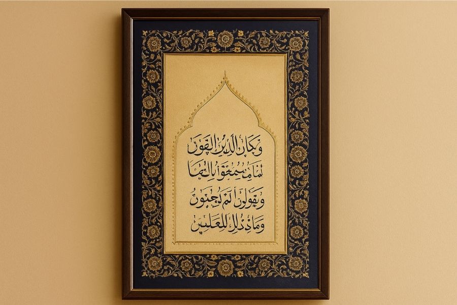 Tabloda kullanılan altın varak süslemeler ve lacivert bordür, Osmanlı sanatının ihtişamını modern baskı teknikleriyle bir araya getirir. Yüksek kaliteli kanvas üzerine işlenen yazılar ve detaylı motifler, uzun yıllar boyunca canlılığını koruyacak şekilde tasarlanmıştır. Büyük boyutuyla salon, ofis, cami ve geniş alanlarda estetik bir merkez noktası oluşturur.